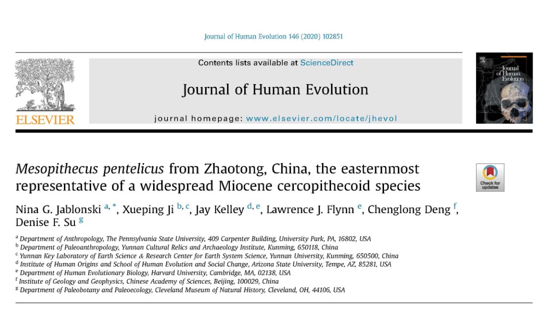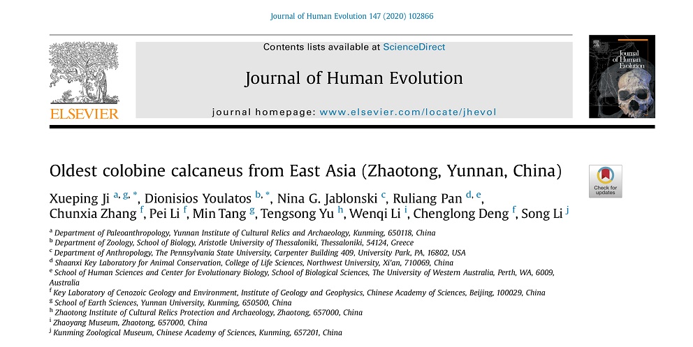 2020年8月7日和8月28日,国际人类学权威刊物《人类进化(Journal of Human Evolution)》分别以《东亚最古老的疣猴类跟骨》和《广泛分布(于欧亚大陆)的中新世猴科最东部的代表---奔德里中猴在中国昭通的发现》为题,同期在线发表两篇论文,这是云南省文物考古研究所与美国宾西法尼亚大学共同主持的昭通新近纪古猿动物群研究的最新成果。
