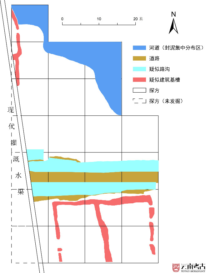 发掘共布设探方23个,均为正北方向,西侧边缘几个探方,因灌溉水渠阻碍,未完全发掘,其余均为10×10米探方,实际发掘面积约2000平方米。
