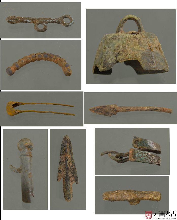 本次发掘出土遗物十分丰富,迄今为止,各类文物小件有200余件,包括铜器(箭镞、钱币、盖弓帽、带钩、钉、铃、环等),铁器(犁、箭镞、刀、环、钉等),陶器(碗、罐、网坠、纺轮、弹丸、圆陶片等),玉石类器物(磨石、石砧、石锛、镯、珏、串珠等),骨蚌器(锥、笄、针、经纬刀、饰品、海贝等)等;出土大量建筑构件,包括筒瓦、板瓦、瓦当、砖、 泥墙残块(上有木柱痕迹)等,陶片相对较少,以泥质陶为主,器型包括碗、罐、瓮、仓等。